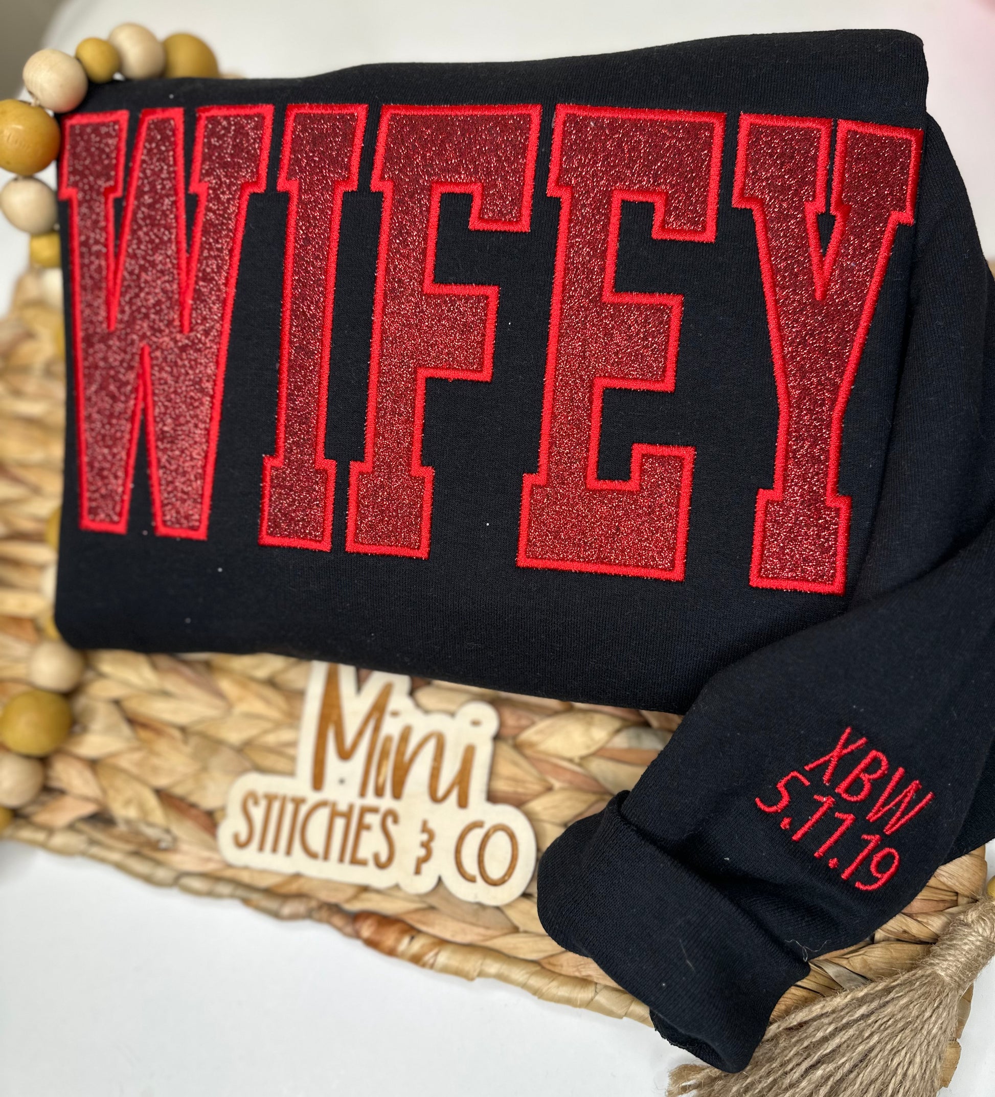 Celebrate your status with this fun and fabulous Glitter Wifey Sweatshirt! Featuring eye-catching glitter lettering, it's the perfect way to show off your newlywed pride or treat yourself to a little self-love. Want to make it extra special? Add personalized sleeve details to customize it just for you—or keep it classic with the standard design. Cozy, comfortable, and unapologetically fun, this sweatshirt is a wardrobe essential for any proud wife.